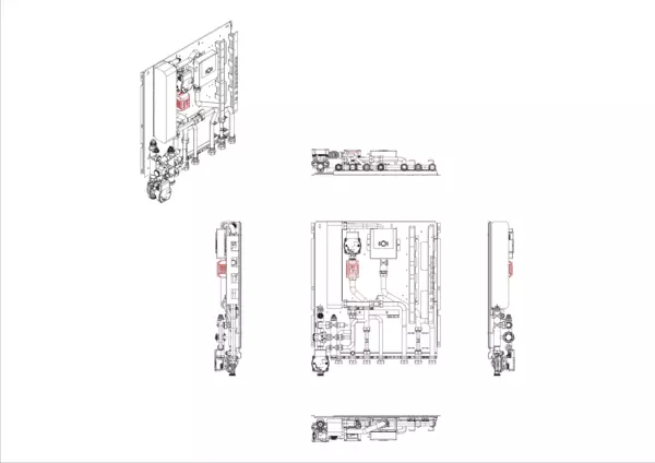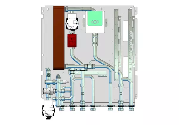 Frischwassermodul auf Montageplatte für modulare Bauweise der Frischwasser-Wohnungsstation Friwara-W32-FBR-HT. Das Frischwassermodul dient der Warmwasserversorgung und der Versorgung und Regelung von Flächenheizungen mit Festwertregler 20-50 °C mit integrierter Pumpe.