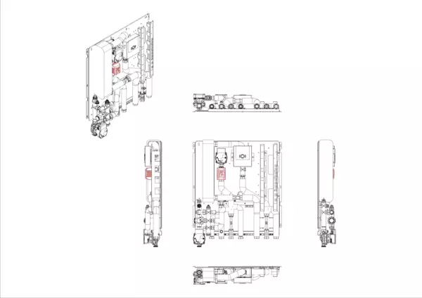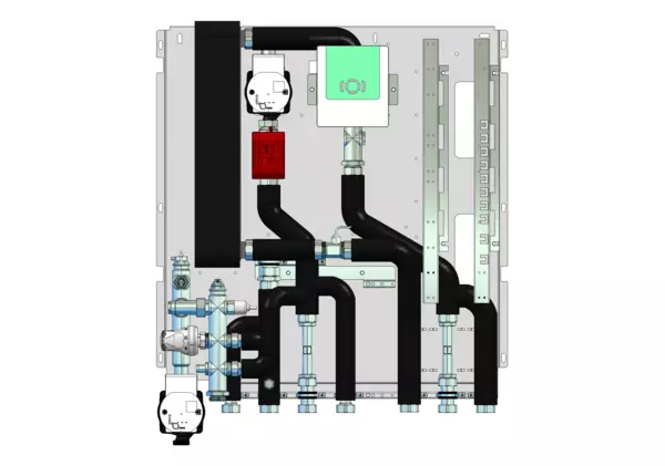 Frischwassermodul auf Montageplatte für modulare Bauweise der Frischwasser-Wohnungsstation Friwara-W32-FBR-HT. Das Frischwassermodul dient der Warmwasserversorgung und der Versorgung und Regelung von Flächenheizungen mit Festwertregler 20-50 °C mit integrierter Pumpe.