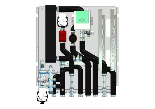 Frischwassermodul auf Montageplatte für modulare Bauweise der Frischwasser-Wohnungsstation Friwara-W32-FBR-HT. Das Frischwassermodul dient der Warmwasserversorgung und der Versorgung und Regelung von Flächenheizungen mit Festwertregler 20-50 °C mit integrierter Pumpe.