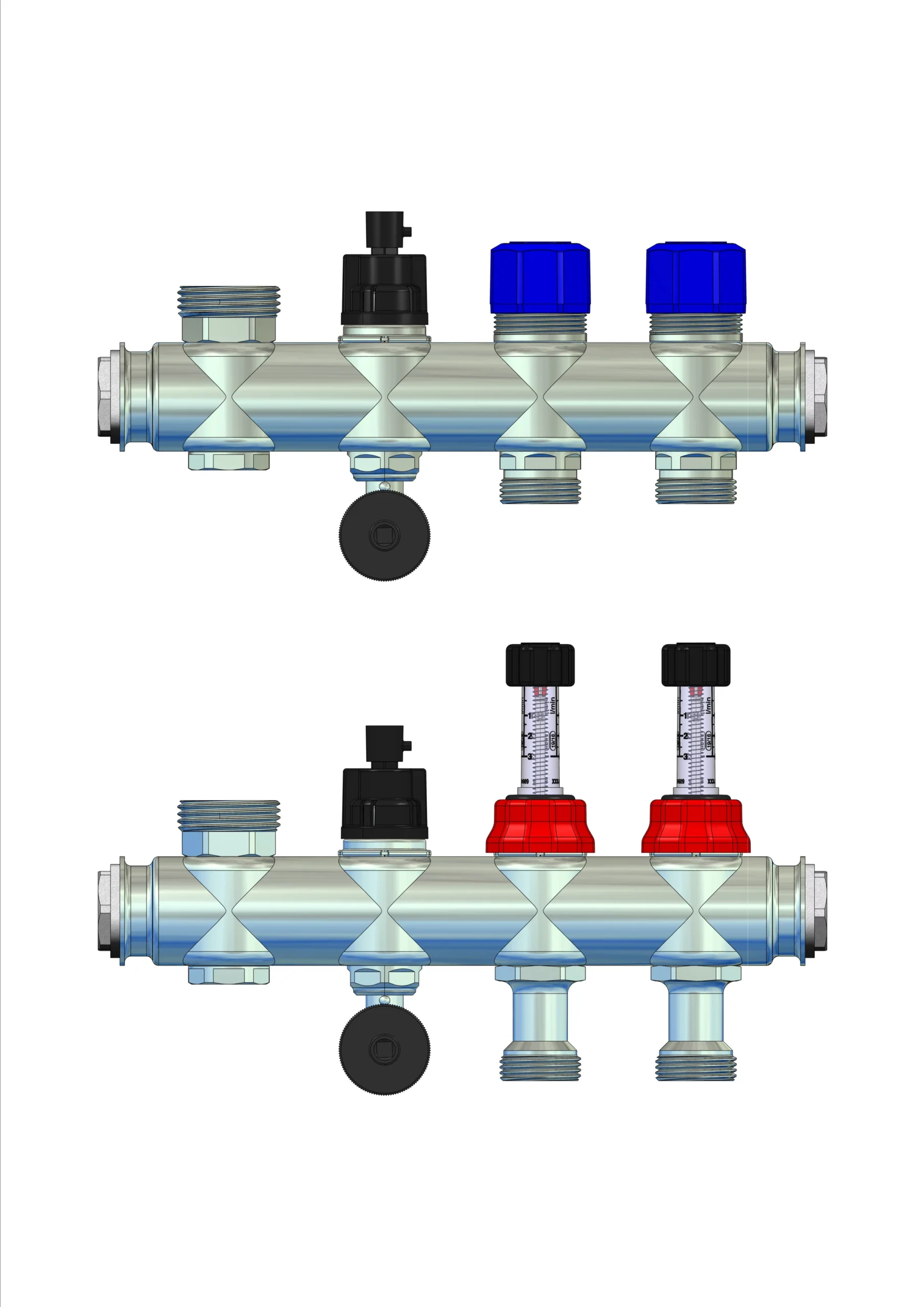 Module 5 Anschlussverteiler mit integrierte Durchflussanzeiger 0-3 l/min im Vorlaufbalken und Thermostatventileinsätze M30x1,5 im Rücklaufbalken, Spül-, Füll-, Entleer- und Entlüftungsventil im Vor- und Rücklaufbalken, Primär 1"AG nach oben