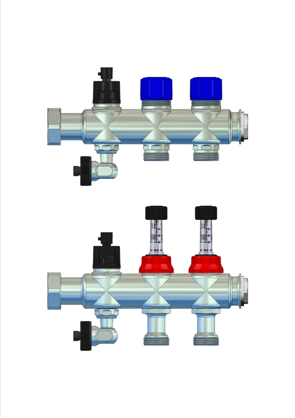 Module 5 Anschlussverteiler mit integrierte Durchflussanzeiger 0-3 l/min im Vorlaufbalken und Thermostatventileinsätze M30x1,5 im Rücklaufbalken, Spül-, Füll-, Entleer- und Entlüftungsventil im Vor- und Rücklaufbalken, Primär 1"ÜW seitlich