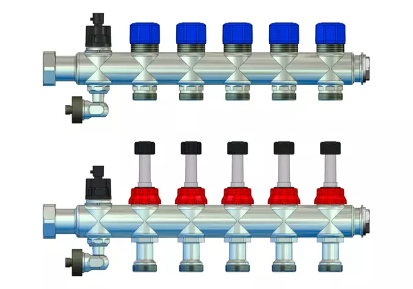 Module 5 Anschlussverteiler mit integrierte Durchflussanzeiger 0-3 l/min im Vorlaufbalken und Thermostatventileinsätze M30x1,5 im Rücklaufbalken, Spül-, Füll-, Entleer- und Entlüftungsventil im Vor- und Rücklaufbalken, Primär 1"ÜW seitlich