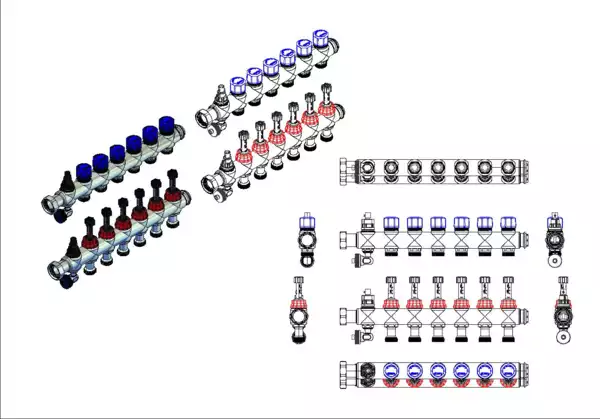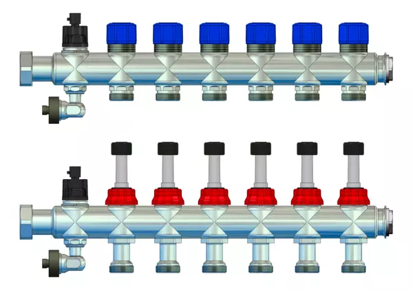 Module 5 Anschlussverteiler mit integrierte Durchflussanzeiger 0-3 l/min im Vorlaufbalken und Thermostatventileinsätze M30x1,5 im Rücklaufbalken, Spül-, Füll-, Entleer- und Entlüftungsventil im Vor- und Rücklaufbalken, Primär 1"ÜW seitlich