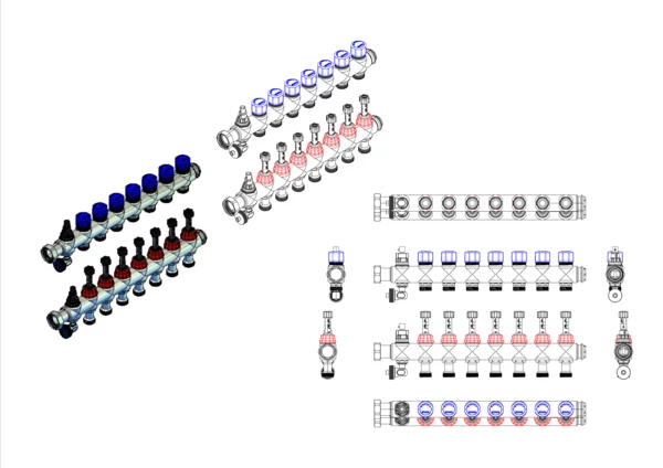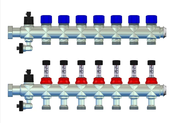 Module 5 Anschlussverteiler mit integrierte Durchflussanzeiger 0-3 l/min im Vorlaufbalken und Thermostatventileinsätze M30x1,5 im Rücklaufbalken, Spül-, Füll-, Entleer- und Entlüftungsventil im Vor- und Rücklaufbalken, Primär 1"ÜW seitlich