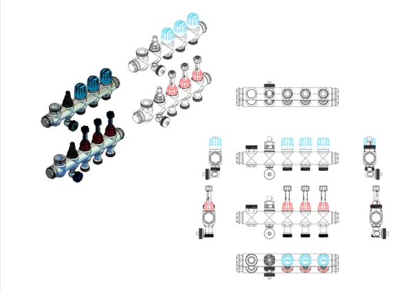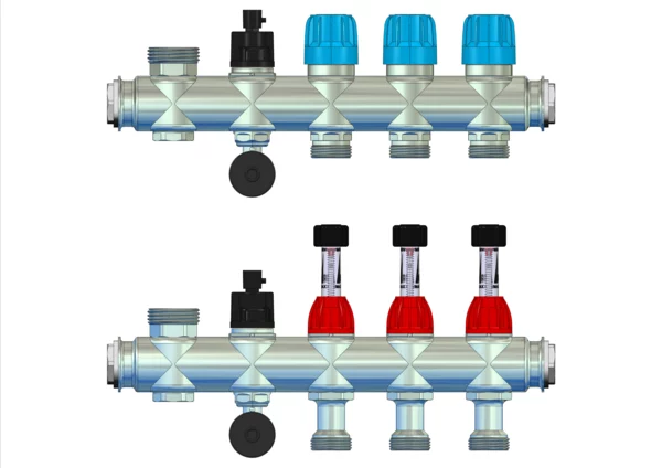 Module 5 Anschlussverteiler mit integrietem Durchflussanzeiger min/max. im Vorlaufbalken und Thermostatventileinsatz mit Aufnahme für EGO-Regelantrieb im Rücklaufbalken, mit 3/4" Kugelhahn und Spül-, Füll-, Entleer- und Entlüftungsventil, Primär 1"AG nach oben