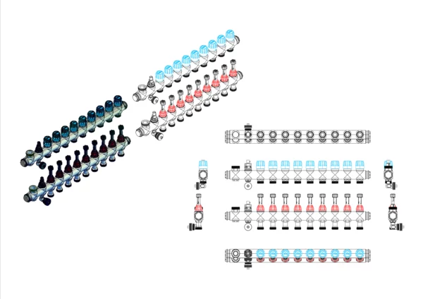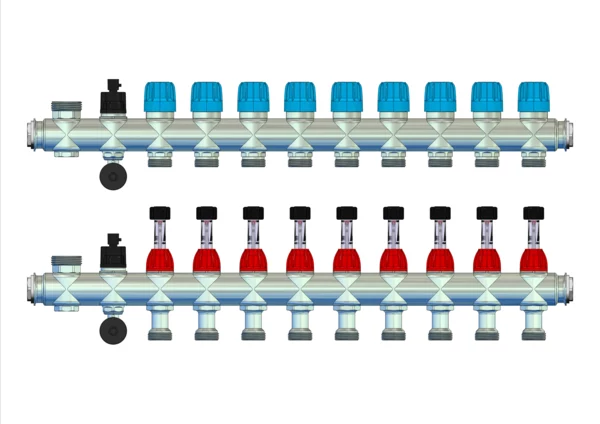 Module 5 Anschlussverteiler mit integrietem Durchflussanzeiger min/max. im Vorlaufbalken und Thermostatventileinsatz mit Aufnahme für EGO-Regelantrieb im Rücklaufbalken, mit 3/4" Kugelhahn und Spül-, Füll-, Entleer- und Entlüftungsventil, Primär 1"AG nach oben