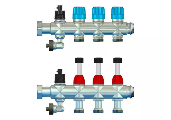 Module 5 Anschlussverteiler mit integrietem Durchflussanzeiger min/max. im Vorlaufbalken und Thermostatventileinsatz mit Aufnahme für EGO-Regelantrieb im Rücklaufbalken, mit 3/4" Kugelhahn und Spül-, Füll-, Entleer- und Entlüftungsvent., Primär 1"ÜW seitlich