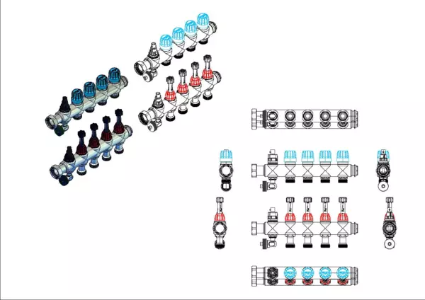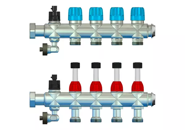 Module 5 Anschlussverteiler mit integrietem Durchflussanzeiger min/max. im Vorlaufbalken und Thermostatventileinsatz mit Aufnahme für EGO-Regelantrieb im Rücklaufbalken, mit 3/4" Kugelhahn und Spül-, Füll-, Entleer- und Entlüftungsvent., Primär 1"ÜW seitlich