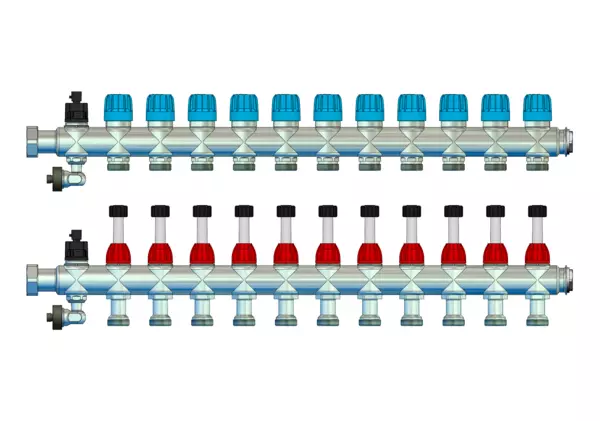 Module 5 Anschlussverteiler mit integrietem Durchflussanzeiger min/max. im Vorlaufbalken und Thermostatventileinsatz mit Aufnahme für EGO-Regelantrieb im Rücklaufbalken, mit 3/4" Kugelhahn und Spül-, Füll-, Entleer- und Entlüftungsvent., Primär 1"ÜW seitlich