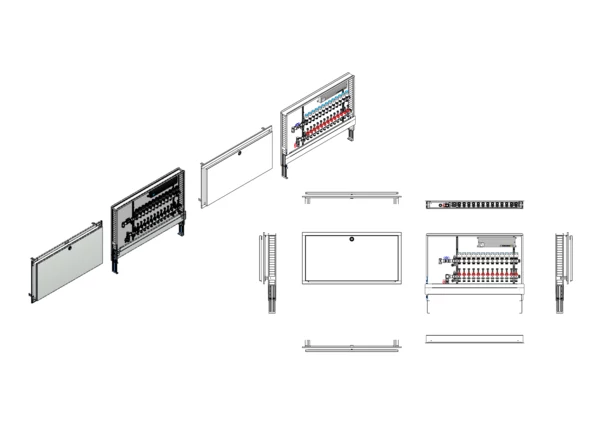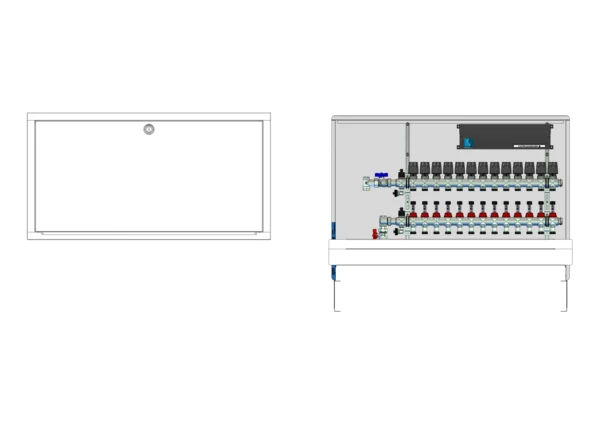 vertikale Anschlussgarnitur ohne Wärmezählerverrohrung, Verteiler mit Durchflussanzeiger 0-3 l/min im Vorlaufbalken und Thermostatventileinsatz M30x1,5 im Rücklaufbalken, vormontierte Stellantriebe und Klemmleiste mit Vorverdrahtung, Standard-Unterputz-Schrank mit Frontblende in RAL 9016
