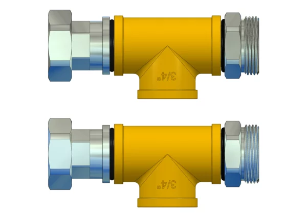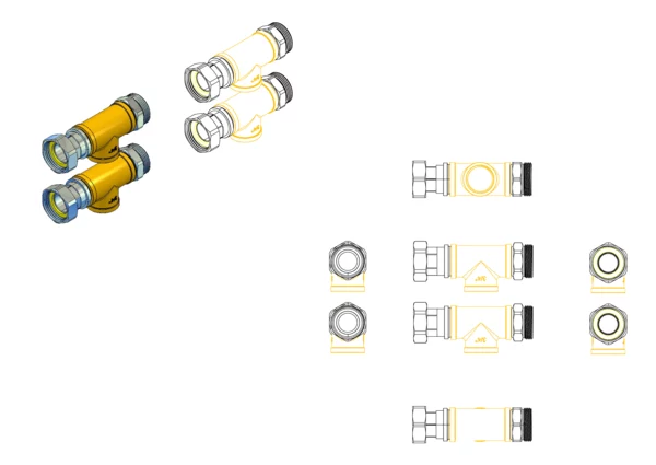 Das Anschluss-T-Stück-Set für einen zusätzlichen Subverteilerabgang kann in strawa Anschlussstationen H und Comfort-Anschlusstationen FBH montiert werden.
