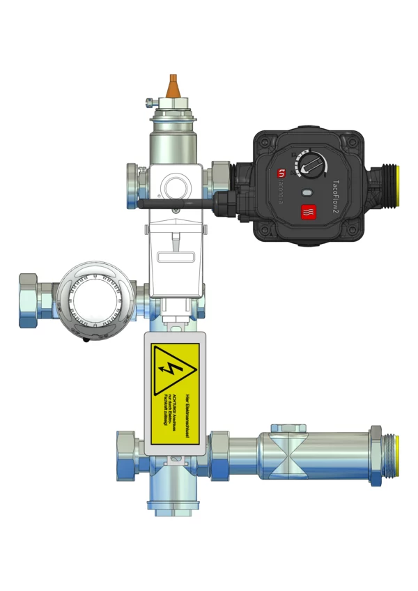 Festwertregler 20-50 Grad Celsius und Pumpe TacoFlow2 15-60/130W, bis 120 m2 Heizfläche, mit Temperaturbegrenzer 55 Grad Celsius, Primär horiz. 1"ÜW passend für e-class Anschlussgarnituren, Sekundär 1"AG für e-class Verteiler