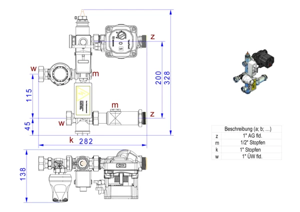 Regelgruppe für Flächenheizungen zur Vorschaltung vor Anschlussverteiler bei hohen Systemtemperaturen, Anschluss horizontal, ausreichend bis ca. 120 m² Fußbodenheizung (abhängig vom Wärmebedarf).