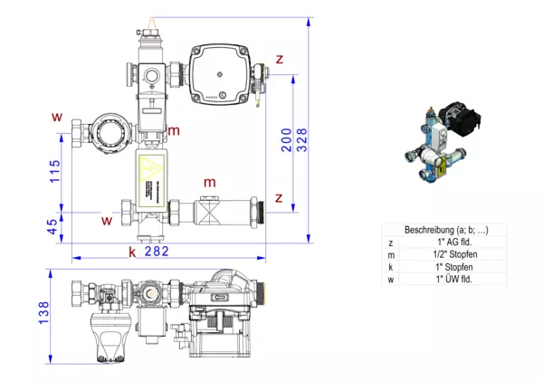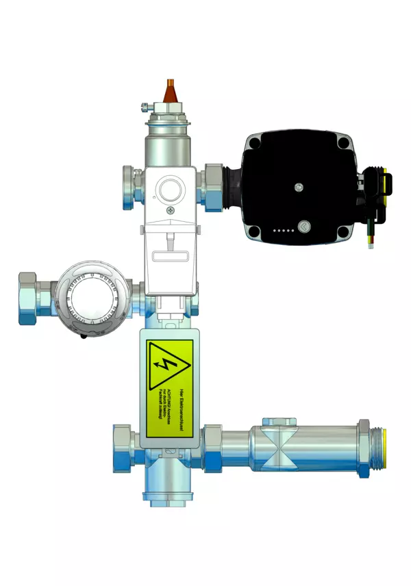 Regelgruppe für Flächenheizungen zur Vorschaltung vor Anschlussverteiler bei hohen Systemtemperaturen Anschluss horizontal, ausreichend bis ca. 120 m² Fußbodenheizung (abhängig vom Wärmebedarf).