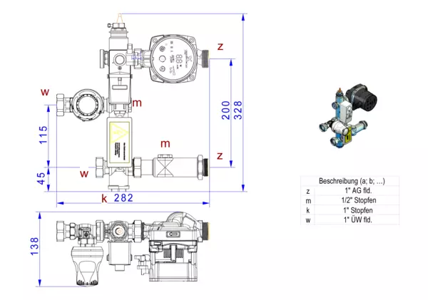 Festwertregler 20-50 Grad Celsius und Pumpe Grundfos UPM3 Auto 15-50 130, bis 120 m2 Heizfläche, mit Temperaturbegrenzer 55 Grad Celsius, Primär horiz. 1"ÜW passend für e-class Anschlussgarnituren, Sekundär 1"AG für e-class Verteiler