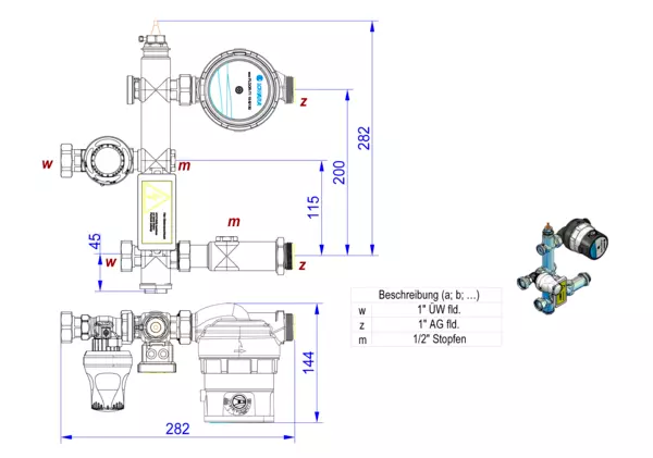 Festwertregler 20-50 Grad Celsius und Pumpe Grundfos UPM3 Auto 15-50 130, bis 120 m2 Heizfläche, mit Temperaturbegrenzer 55 Grad Celsius, Primär horiz. 1"ÜW passend für e-class Anschlussgarnituren, Sekundär 1"AG für e-class Verteiler