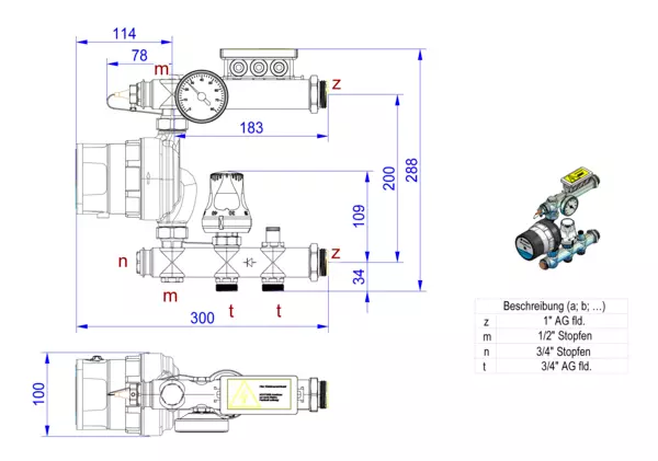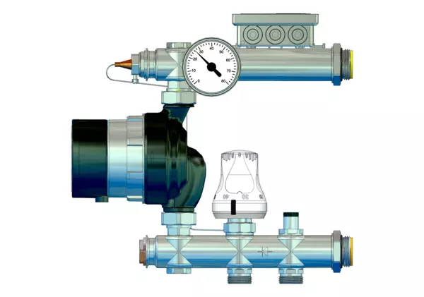 Festwertregler 20-50 Grad Celsius und Pumpe Grundfos UPM3 Auto 15-50 130, bis 120 m2 Heizfläche, mit Temperaturbegrenzer 55 Grad Celsius, Primär vert. 3/4" AG mit Konus für Klemmverschraubungen, Sekundär 1"AG für e-class Verteiler