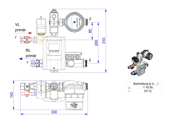 - Anschluss horizontal 1" AG flachdichtend im Vor- und Rücklauf, passend für e-class VA Verteiler