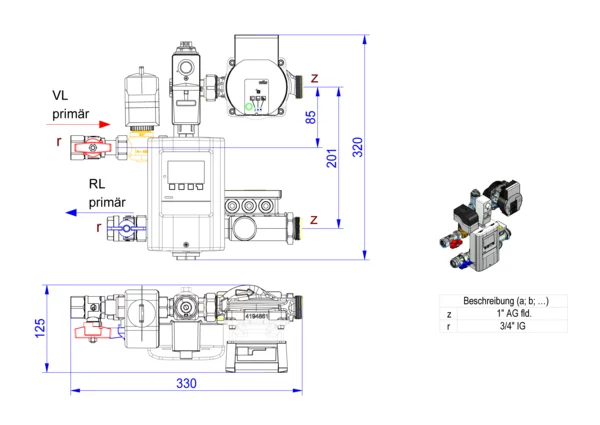 - Kugelhahn 3/4" am Primäranschluss im Vor- und Rücklauf