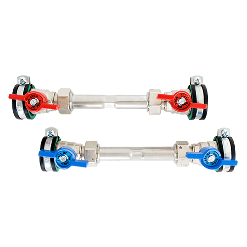 Die Wasserzählerstrecke besteht je einem Wasserzählerdistanzstück 3/4" Länge 110 mm und vor bzw. hinter dem Distanzrohr jeweils ein 3/4" Kugelhahn.