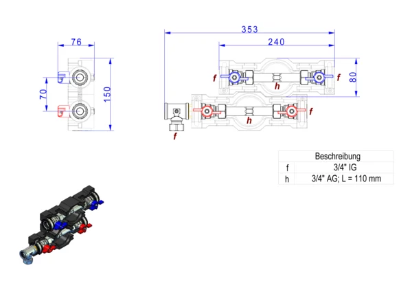 für Wasserzähler Trinkwasser kalt und warm 3/4" Länge 110 mm, mit EPP-Dämmung, mit Zirkulationsanschluss vertikal 3/4"ÜW fld., Montage in Standard-Schränke 69, 80, A