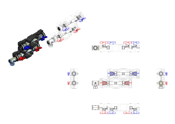 Die Wasserzählereinbaustrecke mit Absperrungen für Trinkwasser kalt und warm mit Zirkulationsanschluss ist für den bauseitigen Einbau in Standard-Anschlussstationen bzw. Standard-Schränke vorgesehen.