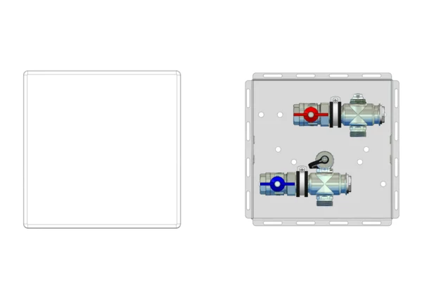 Wohnungsanschlussstation ohne Wärmezählervorbereitung, Primäranschluss horizontal, Wandzarge mit Abdeckung
