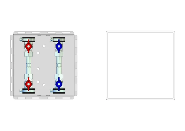 Wasserzählereinbaustation mit Abdeckung glatt in weiß RAL 9016, mit Absperrungen für Trinkwasser kalt + warm