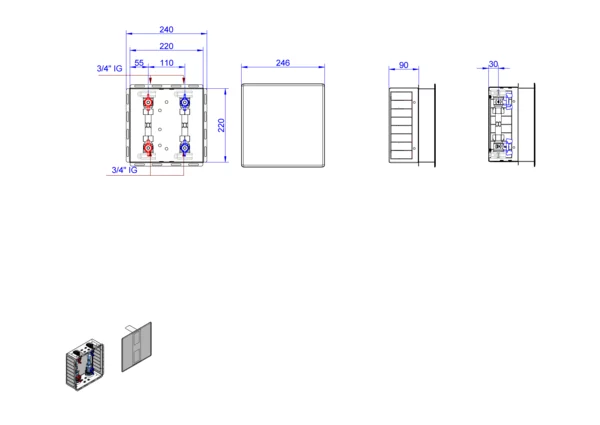 strawa Wasserstation W2,BxHxT: 250 x 250 x 94 mm, Wasserzählervorbereitung Trinkwasser kalt und warm 3/4" Länge 80 mm, mit 2x DVGW-Kugelhahn 3/4", in Wandzarge mit Abdeckung weiß RAL 9016