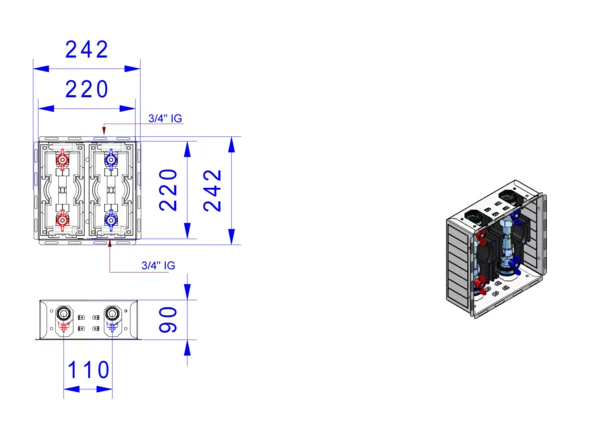 strawa Wasserzarge W2-D-T90,BxHxT: 240 x 240 x 90 mm, Wasserzählervorbereitung Trinkwasser kalt und warm 3/4" Länge 80 mm, mit 2x DVGW-Kugelhahn 3/4", mit EPP-Dämmung, in Wandzarge