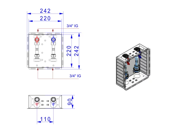 strawa Wasserzarge W2-T90 Typ A,BxHxT: 240 x 240 x 90 mm, Wasserzählervorbereitung Trinkwasser kalt und warm 3/4" Länge 80 mm, mit 1x DVGW-Kugelhahn 3/4", in Wandzarge