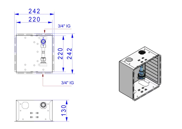 strawa Wasserzarge W1-T130 Typ A,BxHxT: 240 x 220 x 130 mm, Wasserzählervorbereitung Trinkwasser kalt 3/4" Länge 80 mm, mit 1x DVGW-Kugelhahn 3/4", in Wandzarge geeignet für Wasserzähler mit Funkauslesung