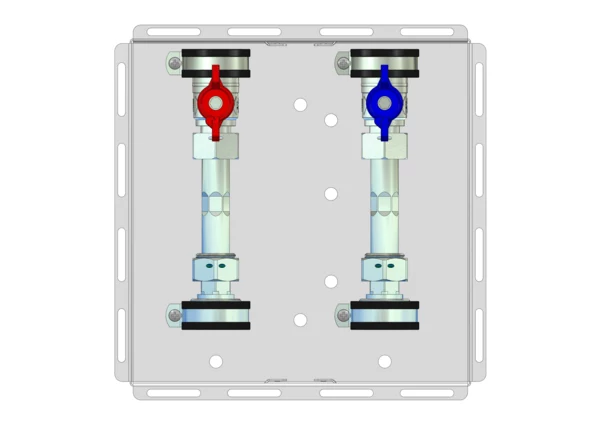 Wasserzählereinbaustation ohne Abdeckung, mit Absperrungen für Trinkwasser kalt + warm. Die Einbautiefe 130 mm der Zarge ist besonders geeignet für Wasserzähler mit Funkauslesung.