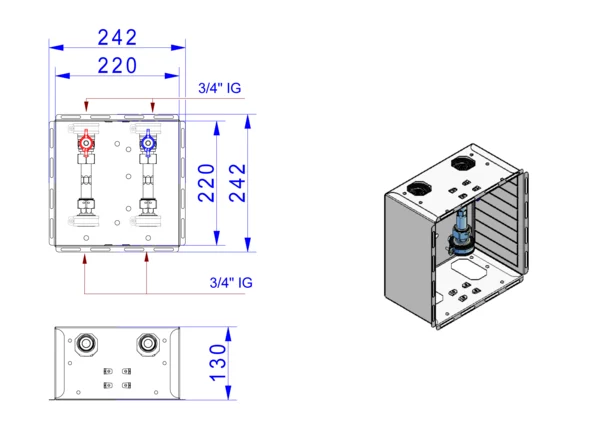 strawa Wasserzarge W2-T130 Typ A,BxHxT: 240 x 220 x 130 mm, Wasserzählervorbereitung Trinkwasser kalt und warm 3/4" Länge 80 mm, mit 1x DVGW-Kugelhahn 3/4", in Wandzarge geeignet für Wasserzähler mit Funkauslesung