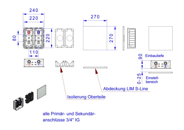 strawa Wasserstation W2-LIM-D-S-Line Typ A,BxHxT: 270 x 270 x 106 mm, Wasserzählervorbereitung Trinkwasser kalt und warm 3/4" Länge 80 mm, mit 1x DVGW-Kugelhahn 3/4", mit EPP-Dämmung, in Wandzarge mit Abdeckung Limodor S-Line
