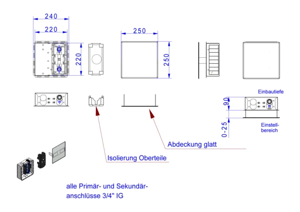 strawa Wasserstation W1-D,BxHxT: 250 x 250 x 94 mm, Wasserzählervorbereitung Trinkwasser kalt 3/4" Länge 80 mm, mit 2x DVGW-Kugelhahn 3/4", mit EPP-Dämmung, in Wandzarge mit Abdeckung weiß RAL 9016