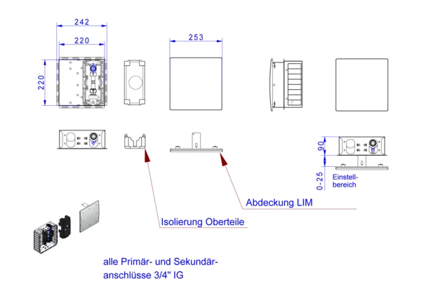 strawa Wasserstation W1-LIM-D Typ A,BxHxT: 246 x 246 x 108 mm, Wasserzählervorbereitung Trinkwasser kalt 3/4" Länge 80 mm, mit 1x DVGW-Kugelhahn 3/4", mit EPP-Dämmung, in Wandzarge mit Abdeckung Limodor