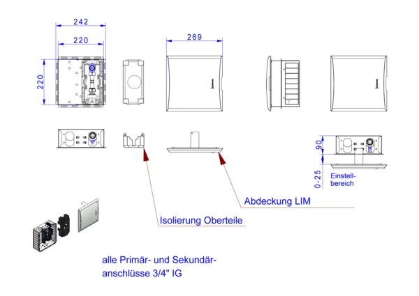 strawa Wasserstation W1-LIM-D-Premium Typ A,BxHxT: 272 x 272 x 112 mm, Wasserzählervorbereitung Trinkwasser kalt 3/4" Länge 80 mm, mit 1x DVGW-Kugelhahn 3/4", mit EPP-Dämmung, in Wandzarge mit Abdeckung Limodor Premium