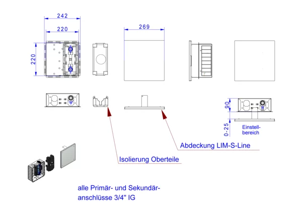 strawa Wasserstation W1-LIM-D-S-Line,BxHxT: 270 x 270 x 106 mm, Wasserzählervorbereitung Trinkwasser kalt 3/4" Länge 80 mm, mit 2x DVGW-Kugelhahn 3/4", mit EPP-Dämmung, in Wandzarge mit Abdeckung Limodor S-Line