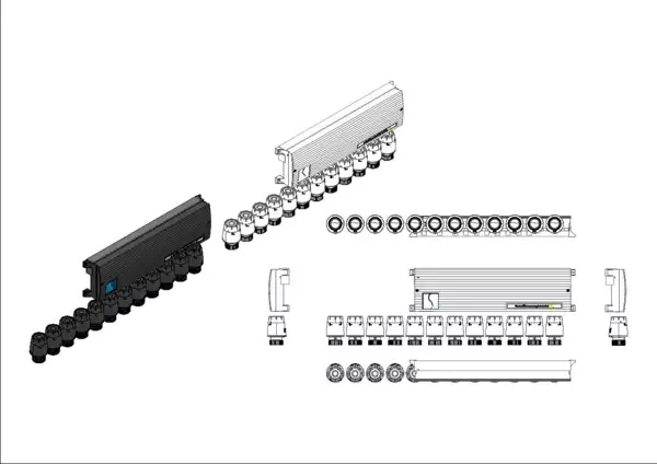 Die Vorverdrahtung ist für die Anschlussverteiler e-class 53, 63, 87 und Standard-Anschlussstationen H 53, H 63 Stationen geeignet. Die Stellantriebe sind auf der Klemmleiste vorverdrahtet, welche bauseits im Verteilerschrank, über oder neben dem Heizkreisverteiler montiert ist. Die Stellantriebe werden auf den Ventileinsätzen (Aufnahmegewinde M30x1,5) des Rücklaufbalkens aufgeschraubt.