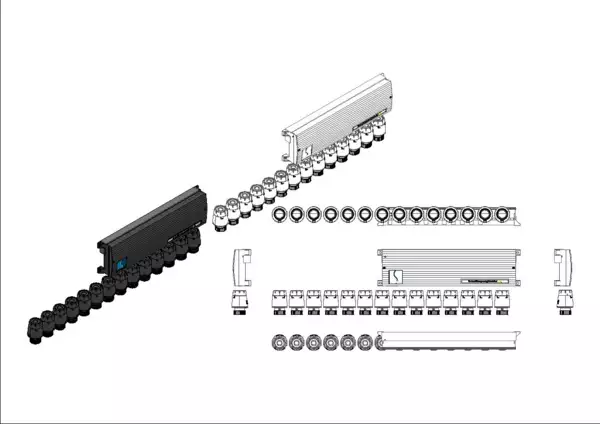 Die Vorverdrahtung ist für die Anschlussverteiler e-class 53, 63, 87 und Standard-Anschlussstationen H 53, H 63 Stationen geeignet. Die Stellantriebe sind auf der Klemmleiste vorverdrahtet, welche bauseits im Verteilerschrank, über oder neben dem Heizkreisverteiler montiert ist. Die Stellantriebe werden auf den Ventileinsätzen (Aufnahmegewinde M30x1,5) des Rücklaufbalkens aufgeschraubt.