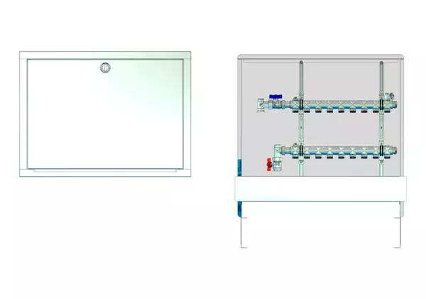 vertikale Anschlussgarnitur ohne Wärmezählerverrohrung, Verteiler ohne Einbauten, Standard-Unterputz-Schrank mit Frontblende in RAL 9016