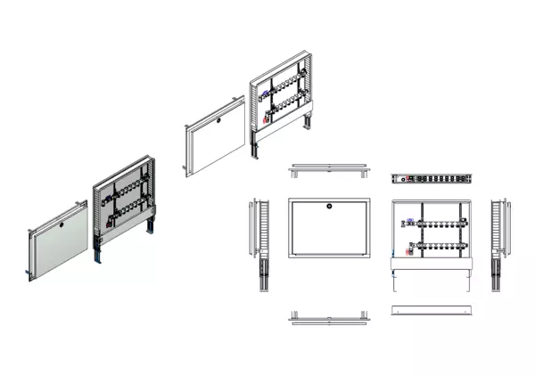 Die Anschlussstation für Heizkörperanbindungen ist im Unterputzschrank montiert und umfasst einen Edelstahlverteiler ohne zusätzliche Einbauten im Heizkreis, sowie eine vertikale Anschlussgarnitur ohne Wärmezählerverrohrung.