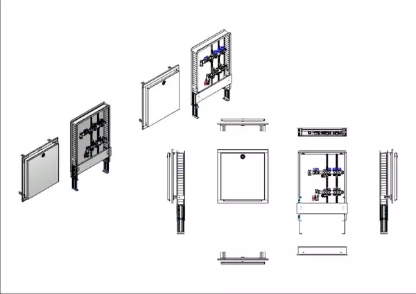 Die Anschlussstation für Flächenheizung und -kühlung ist im Unterputzschrank montiert und umfasst einen Edelstahlverteiler mit integrierten Regulierventilen und Ventileinsätzen (M30x1,5), sowie eine vertikale Anschlussgarnitur ohne Wärmezählerverrohrung. Es gibt Platzhaltungen für eine Klemmleiste und Stellantriebe.