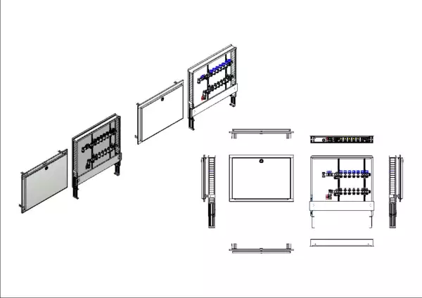 Die Anschlussstation für Flächenheizung und -kühlung ist im Unterputzschrank montiert und umfasst einen Edelstahlverteiler mit integrierten Regulierventilen und Ventileinsätzen (M30x1,5), sowie eine vertikale Anschlussgarnitur ohne Wärmezählerverrohrung. Es gibt Platzhaltungen für eine Klemmleiste und Stellantriebe.