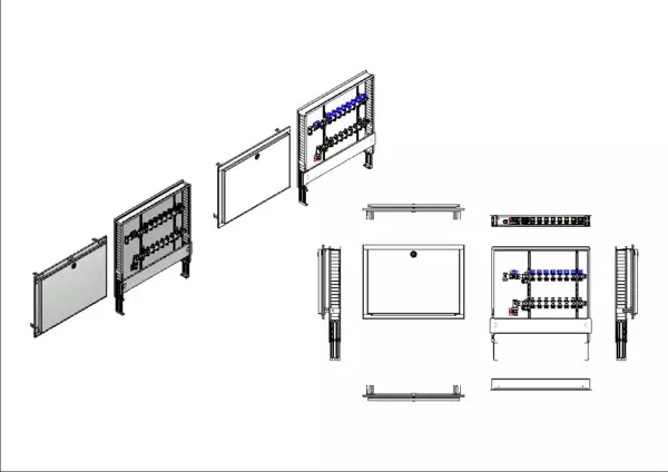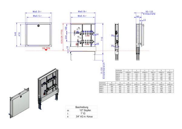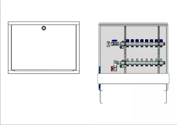 Die Anschlussstation für Flächenheizung und -kühlung ist im Unterputzschrank montiert und umfasst einen Edelstahlverteiler mit integrierten Regulierventilen und Ventileinsätzen (M30x1,5), sowie eine vertikale Anschlussgarnitur ohne Wärmezählerverrohrung. Es gibt Platzhaltungen für eine Klemmleiste und Stellantriebe.