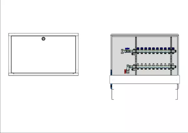 strawa FB-Anschlussstation H 53 10 Hkr.,BxHxT: 900 x 725 x 92 mm, vert. AG o. WMZ, Verteiler mit Regulierventil + THV M30x1,5, Standard-UP-Schrank mit Frontblende in RAL 9016
