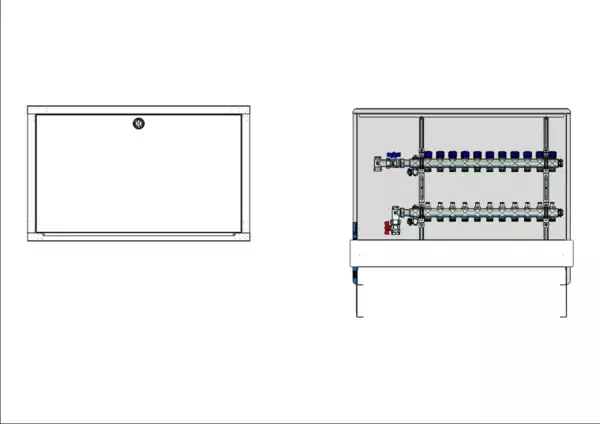 strawa FB-Anschlussstation H 53 11 Hkr.,BxHxT: 900 x 725 x 92 mm, vert. AG o. WMZ, Verteiler mit Regulierventil + THV M30x1,5, Standard-UP-Schrank mit Frontblende in RAL 9016