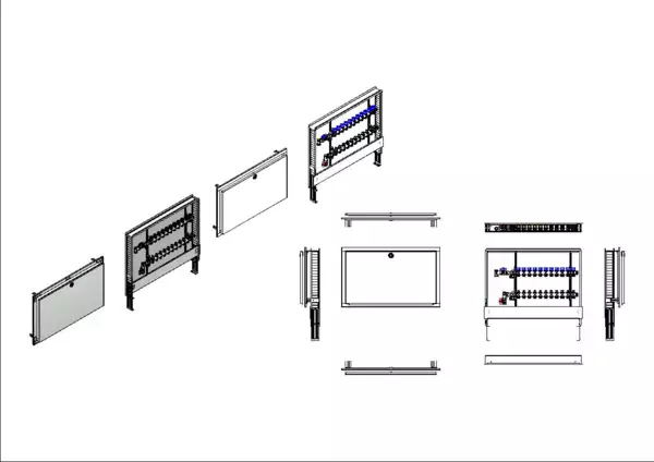 Die Anschlussstation für Flächenheizung und -kühlung ist im Unterputzschrank montiert und umfasst einen Edelstahlverteiler mit integrierten Regulierventilen und Ventileinsätzen (M30x1,5), sowie eine vertikale Anschlussgarnitur ohne Wärmezählerverrohrung. Es gibt Platzhaltungen für eine Klemmleiste und Stellantriebe.