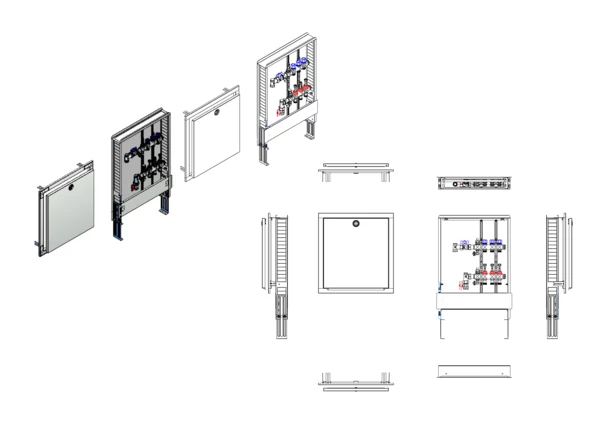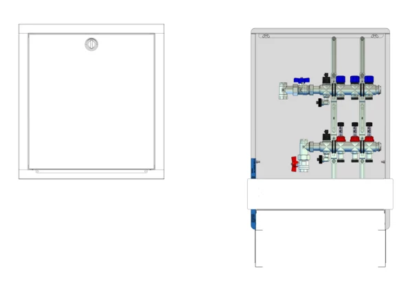strawa FB-Anschlussstation H 63 3 Hkr.,BxHxT: 515x725x92 mm, vert. AG o. WMZ, Verteiler mit DFA 0-3 l/min + THV M30x1,5, Standard-UP-Schrank mit Frontblende in RAL 9016
